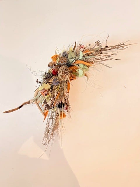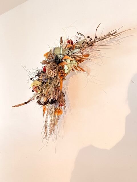 天然の流木に、さまざまなドライフラワーを組み合わせたスワッグです。色とりどりの素材が織りなすナチュラルな雰囲気は、ご自宅のリビングや玄関、さらにはカフェやサロンのアクセントにもぴったりです。お祝いの贈り物や新居へのお祝いや、季節を感じるインテリアとしてもおすすめです。