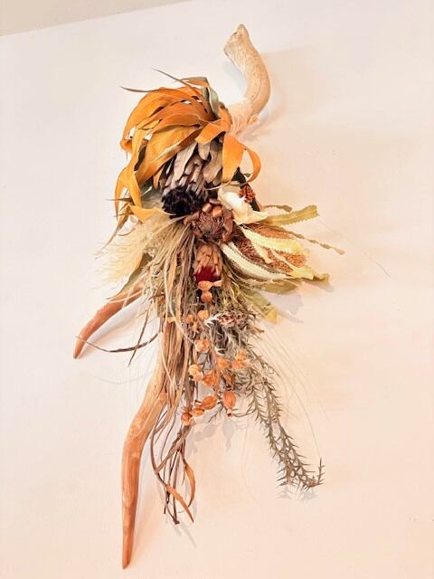 天然の流木と多様なドライフラワーを組み合わせたスワッグです。色とりどりの素材が織りなすナチュラルな雰囲気で、ご自宅のリビングや玄関はもちろん、カフェやサロンのインテリアにもぴったりです。お祝いの贈り物や新居へのプレゼント、季節感を楽しむインテリアとしてもおすすめです。