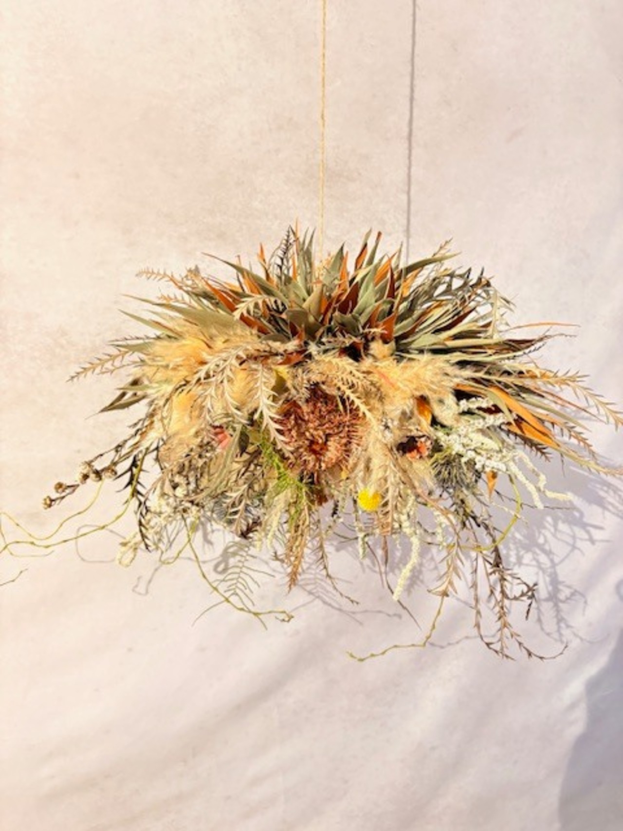 人気のパンパスグラスやヴィレグレア、ワイルドフラワーなどを中心に様々なドライフラワーをふんだんに使用し少しワイルドなイメージもあるアレンジメントです。豊かな色合いと豊満な形状で、お部屋のリビングや玄関、お祝いの贈り物にも最適です。魅力的なインテリアとして、新居のお祝いにも喜ばれることでしょう。